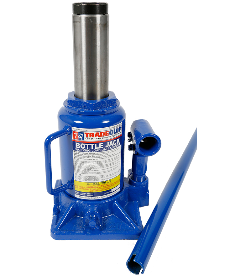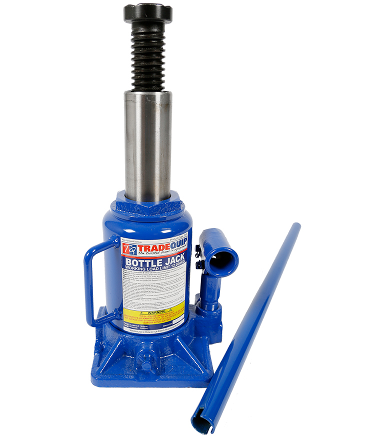 This powerful, heavy-duty TradeQuip "Made for the Trade" Hydraulic Bottle Jack with high quality glide-action pressure pump is designed for hard-hitting commercial use, making large loads easy to lift. The lightweight jack is ideal for lifting farm vehicles, heavy-duty machinery, industrial construction equipment and more. Professional quality, ideal for the workshop or panel shop. Fitted with unique overload protection system and large stable base. Supplied with 500mm pump handle. The low profile design of this hydraulic jack fits underneath tight spots. The jack drops down to just 180mm at its lowest point, making it ideal for use in automotive and ag repair shops, and other small spaces.