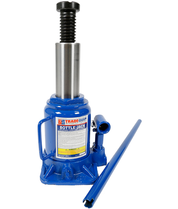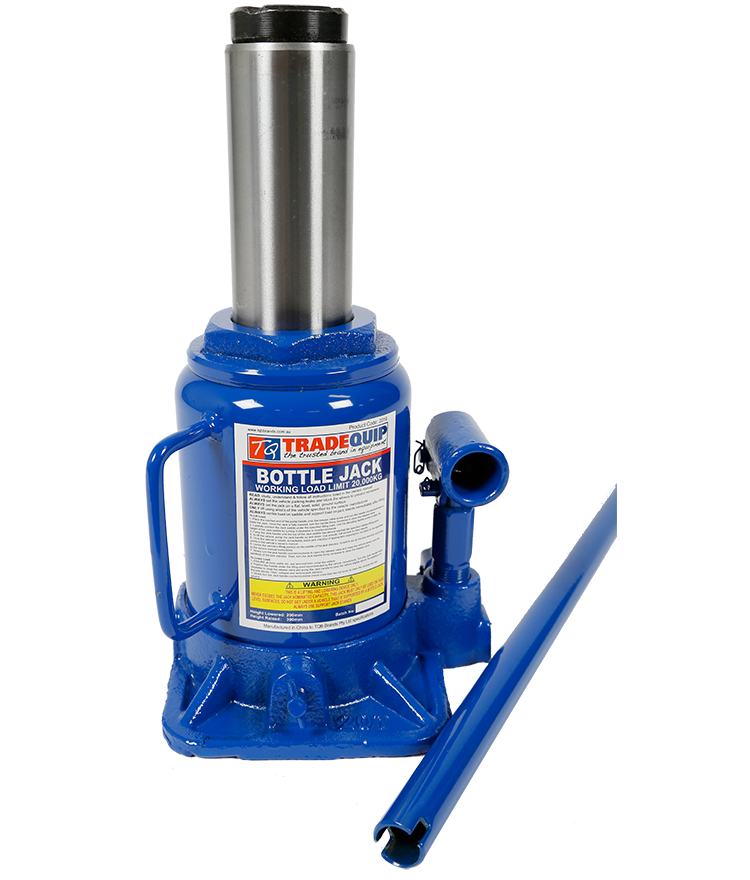 This powerful, heavy-duty TradeQuip "Made for the Trade" Hydraulic Bottle Jack with high quality glide-action pressure pump is designed for hard-hitting commercial use, making large loads easy to lift. The lightweight jack is ideal for lifting farm vehicles, heavy-duty machinery, industrial construction equipment and more. Professional quality, ideal for the workshop or panel shop. Fitted with unique overload protection system and large stable base. Supplied with 500mm pump handle. The low profile design of this hydraulic jack fits underneath tight spots. The jack drops down to just 200mm at its lowest point, making it ideal for use in automotive and ag repair shops, and other small spaces.