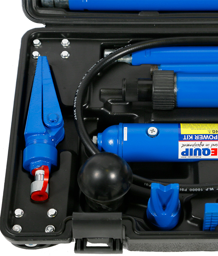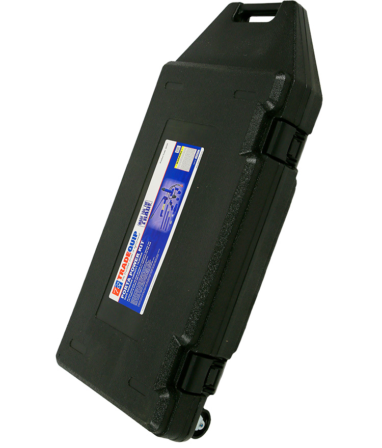 The TradeQuip "Made for the Trade" 10,000kg Hydraulic Porta Power Kit is designed to be used for pushing, spreading, and pressing of vehicle body panels as well as various component parts and assemblies. The variety of attachments include a rubber head, flat base, wedge spreader, spreader toe and various extension tubes with a snap lock design for quick and easy assembly. The pump has an automatic overload system to help prevent damage to the pump ram and associated equipment. The flex head features a permanently moulded rubber pad, interlocked to prevent separation. The complete kit includes a variety of specially designed auto body, frame repair and construction components for lifting, pushing, bending and spreading. (Previous models include product code/s; 2005T, PP10T, PROPP10, RLBRK10)
