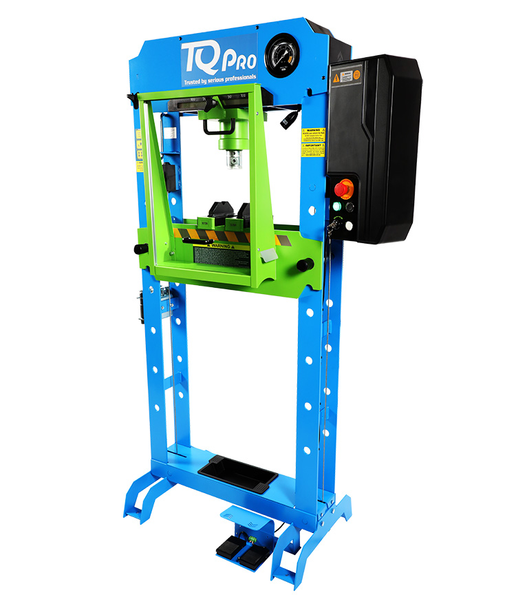 This TQ Pro "Latest Technologies" 30,000kg Electric Hydraulic Workshop Press is capable of bending, pressing or extruding and makes light work of installing ball joints, U-joints and pulleys - making it ideal for many automotive and industrial applications. Polished inner cylinder walls extend the life of the hydraulic seals to minimise abrasion and wear, while the cylinder ram and pistons are also polished and chromed, guided by high performance seals, wear rings and dust seals. Includes a dial gauge for dual metric/tons pressure readings. The strong frames and powerful high-pressure hydraulics will provide years of dependable service in many applications. When components need to be removed or assembled, TQ Pro "Latest Technologies" electric hydraulic presses deliver the controlled power to safely remove and install bearings, gears, U-joints, bushings, ball joints and pulleys with precision and versatility! This 30,000kg Electric Hydraulic Workshop Press features a dual stage pump where the first stage pump quickly extends the ram to the load point & then the second stage engages and provides higher pressure to perform pressing operations. The ram cylinder glides across the width of the upper frame allowing off-centre pressing.